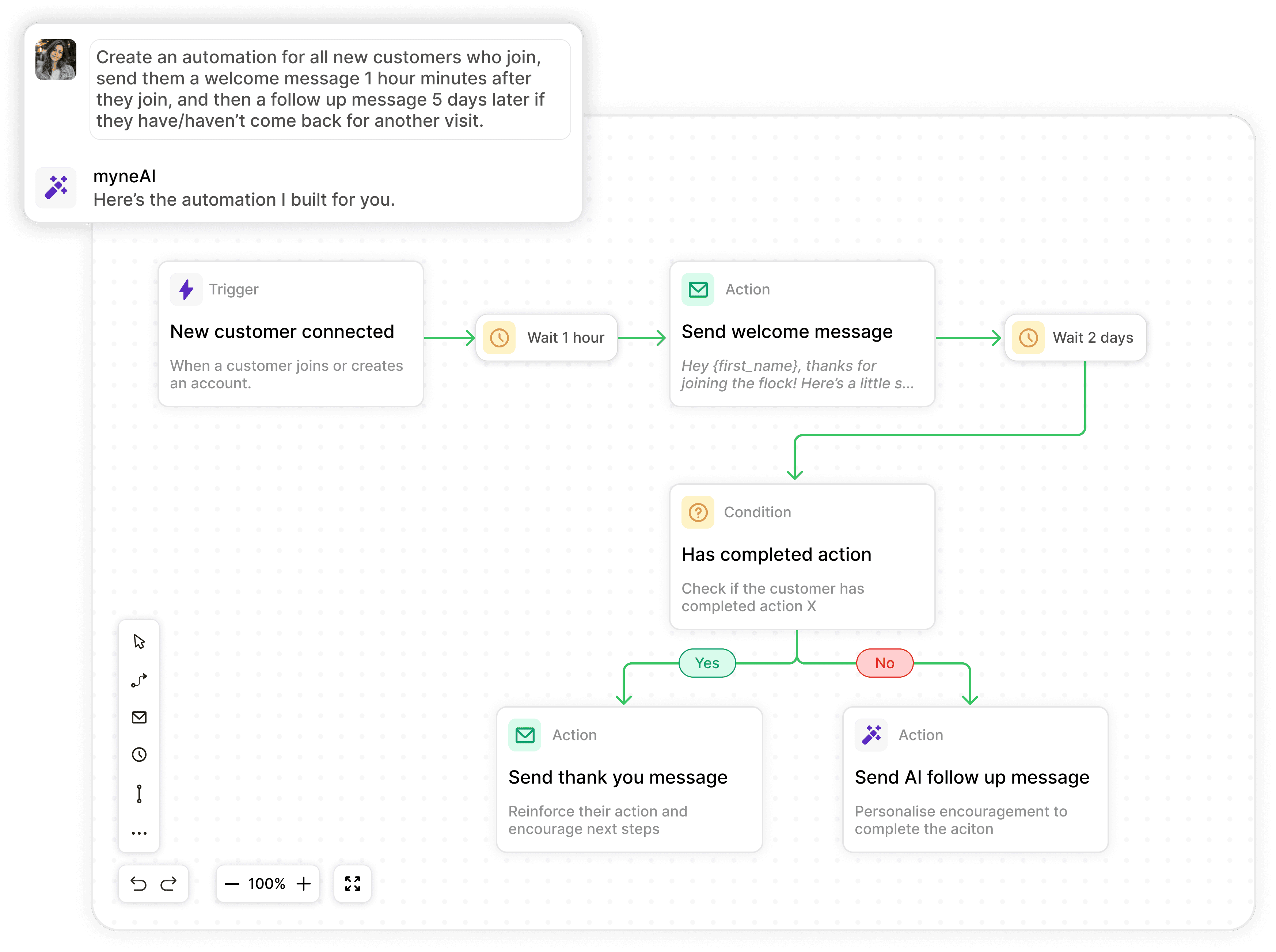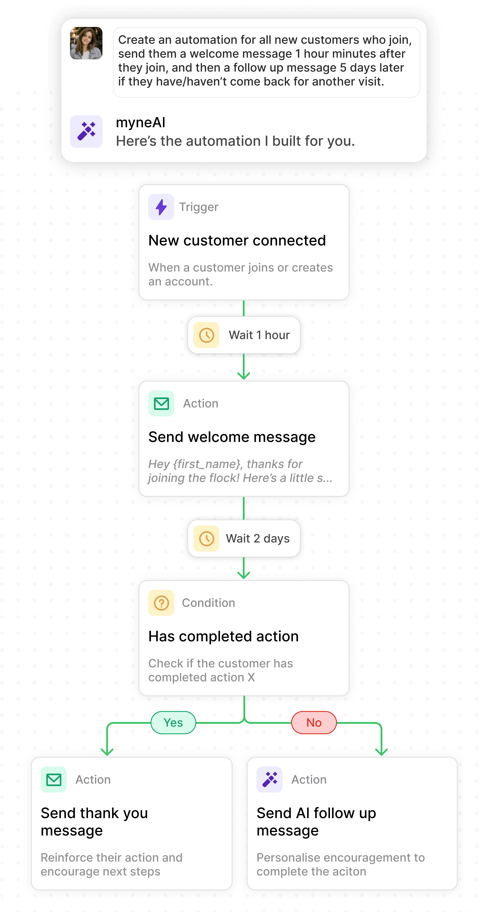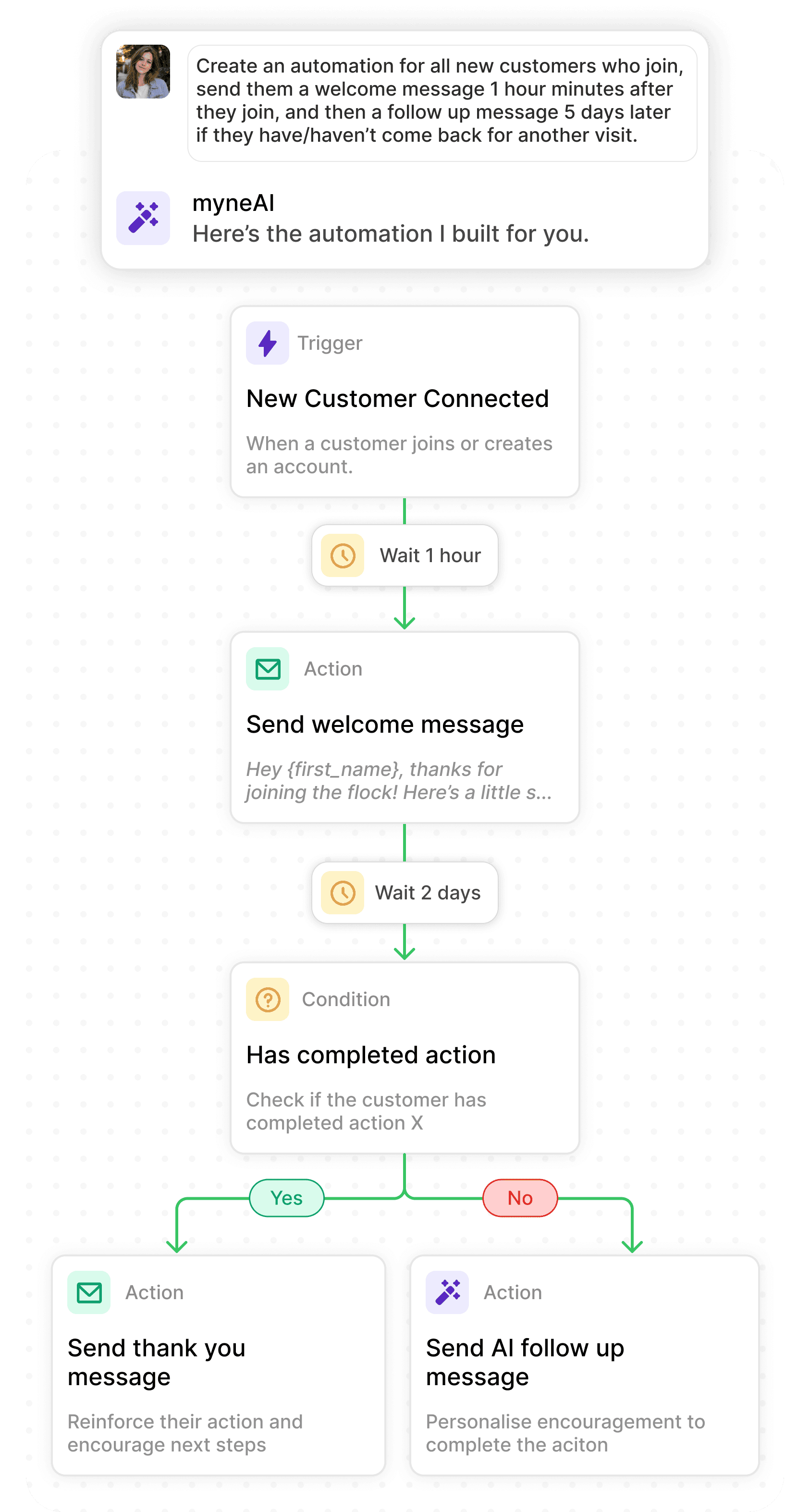 myne uses live customer data to identify who needs attention and trigger the right message, action, or workflow automatically.
