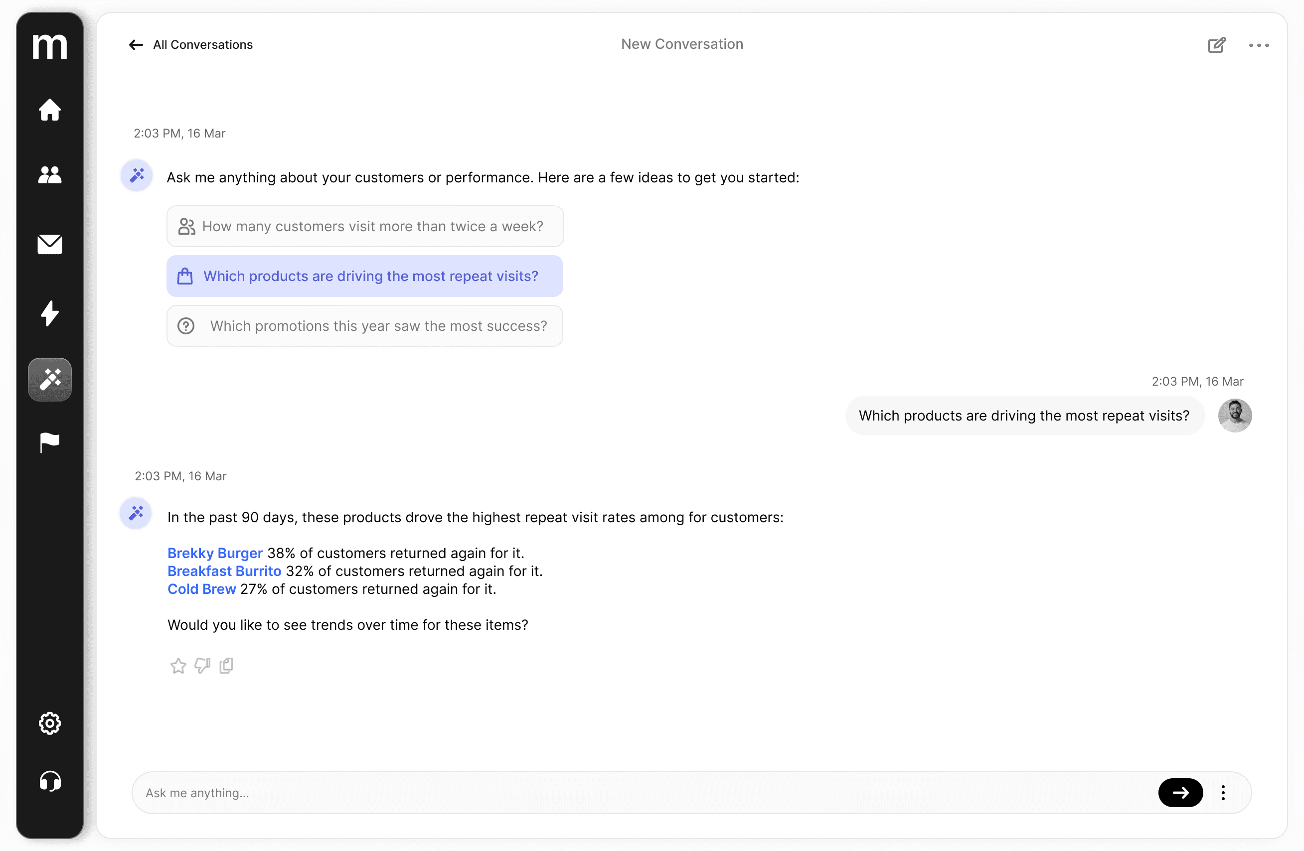 The Analyst doesn’t just fetch data — it helps you plan what to do next. Get recommendations on what data to explore, and what actions you can take to help you move faster on retention and growth.